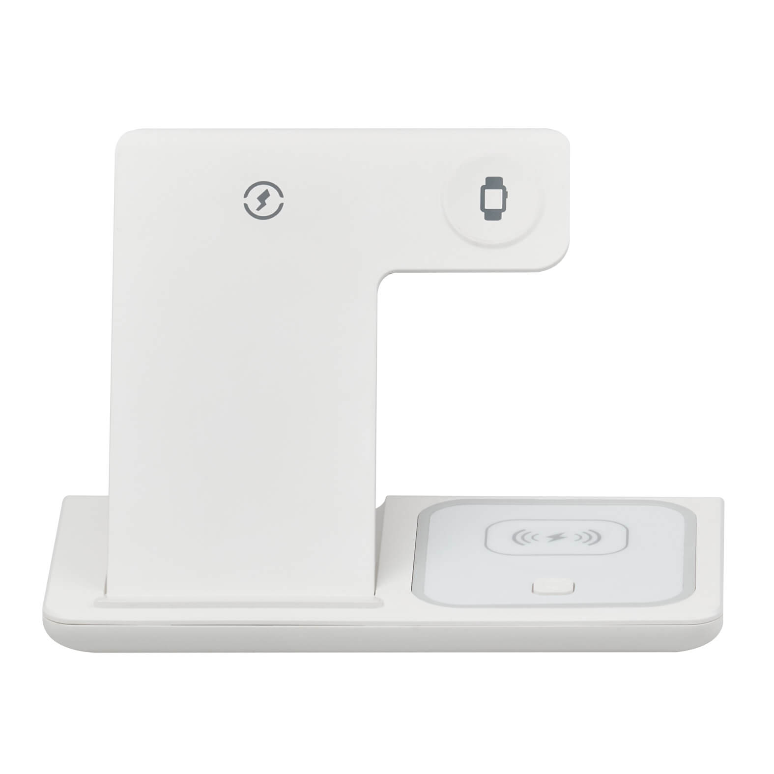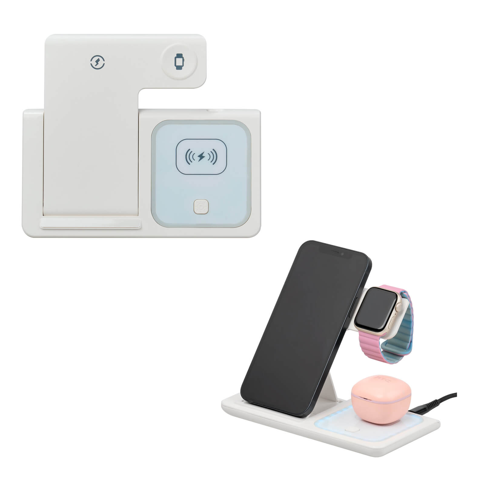 Multicargador inalámbrico plegable 3en 1 para smartphone, audífonos y reloj inteligente. Cuenta con botón para luz e incluye cable de carga tipo C. Compatible solo con dispositivos con tecnología Qi. Material: Plástico.