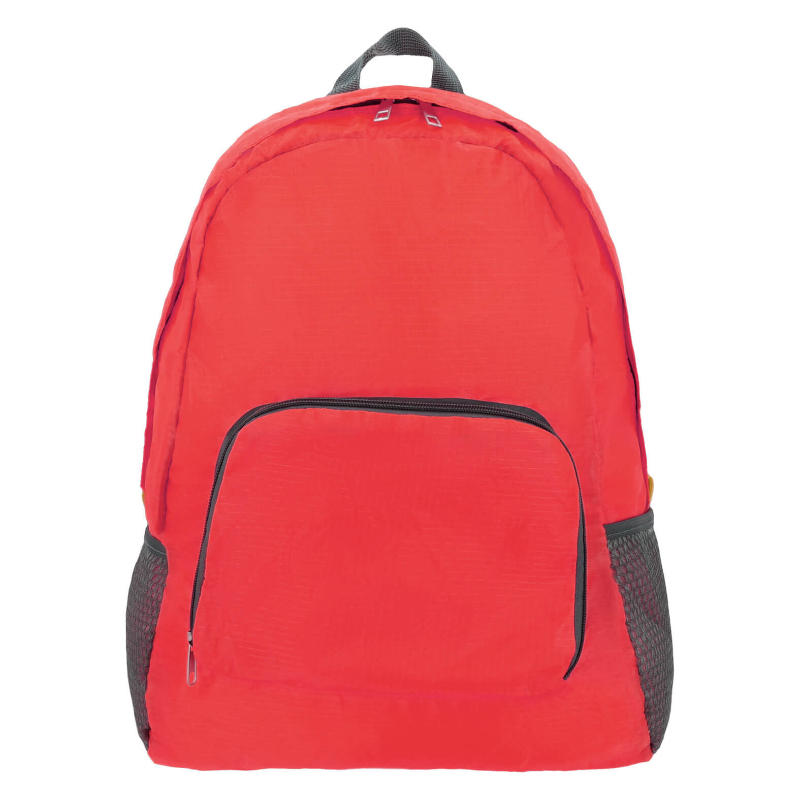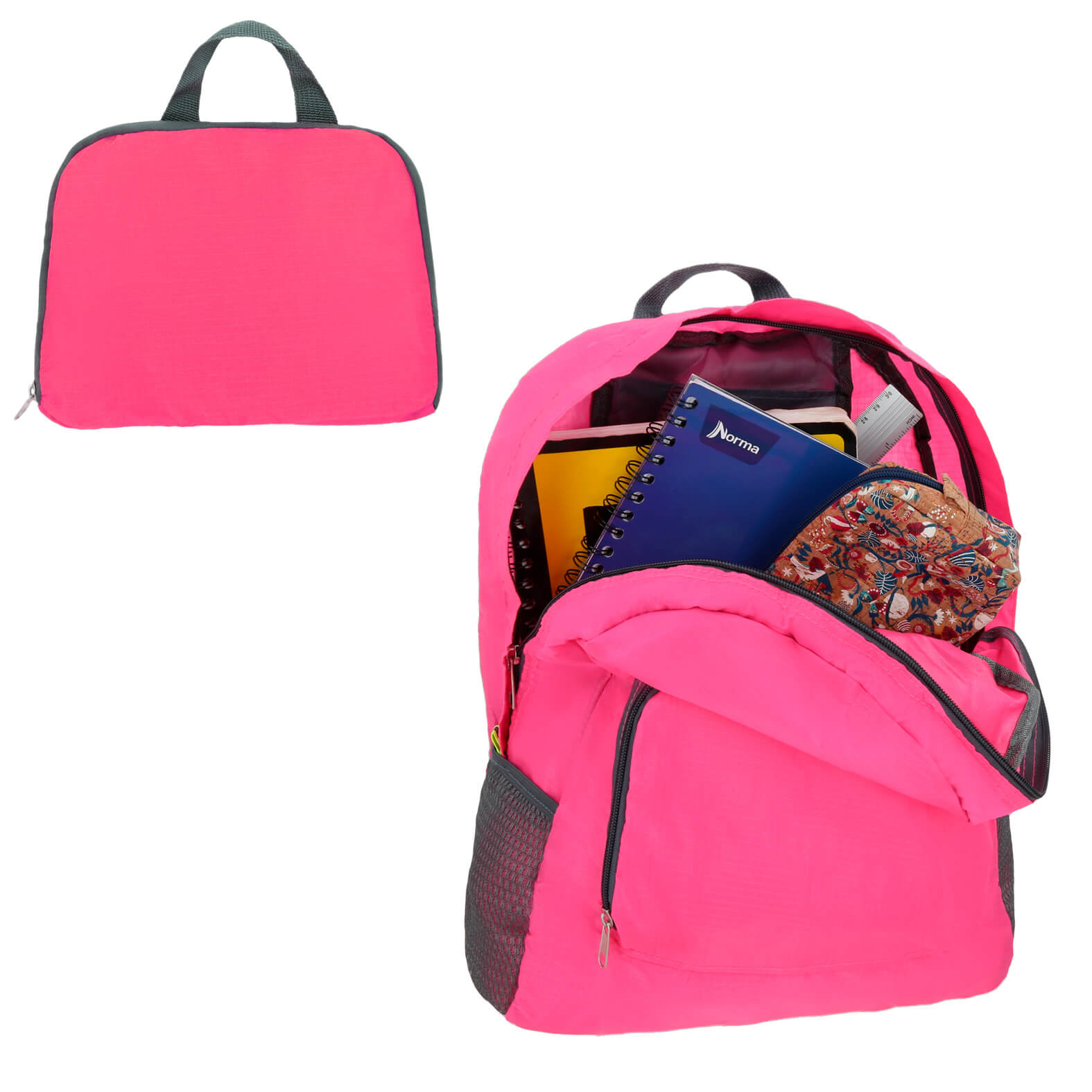 Mochila de 2 compartimentos con cierre y bolsillos laterales de red. Esta mochila se dobla y se convierte en una practica bolsa para llevar.