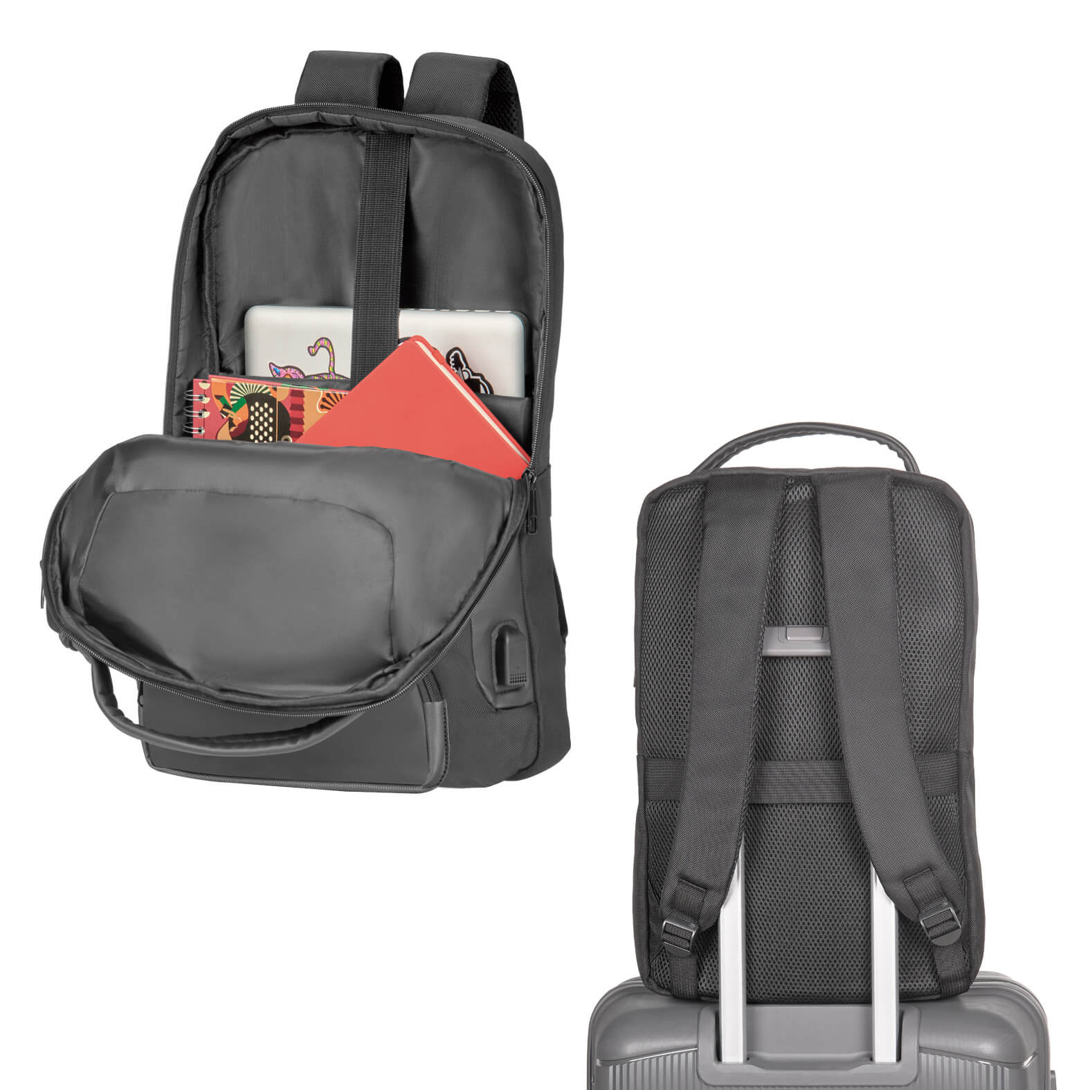 Mochila con compartimento principal con porta laptop de 18″ y candado de seguridad, una bolsa lateral con cierre, puerto de carga USB, tres bolsas frontales, banda Carry on en la parte trasera y asa superior.