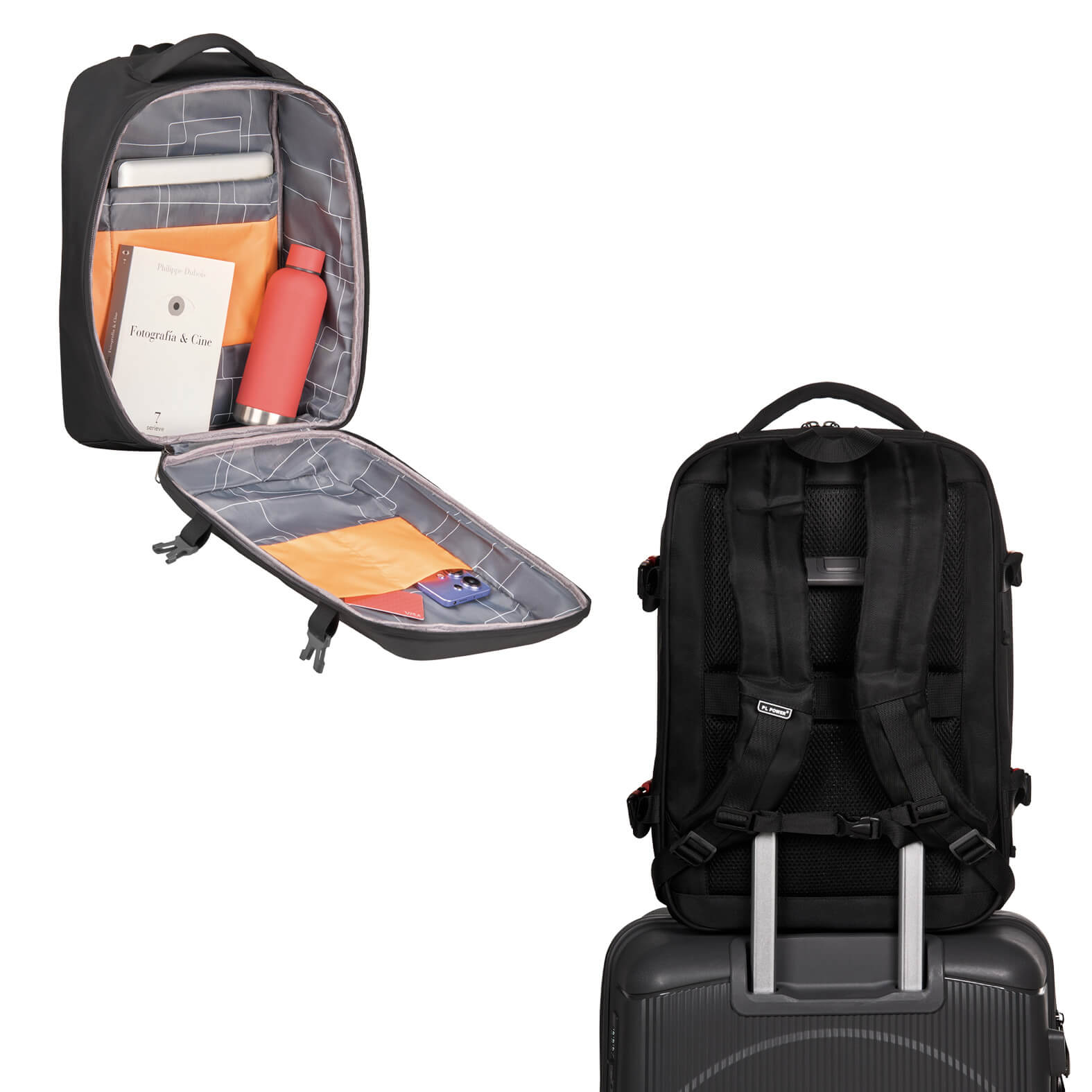 Mochila de carcasa dura con abertura 360, porta laptop de 17.5″ placas, organizadores internos, cuatro broches laterales ajustables, tirantes con broche, respaldo acolchado y cinta Carry on.