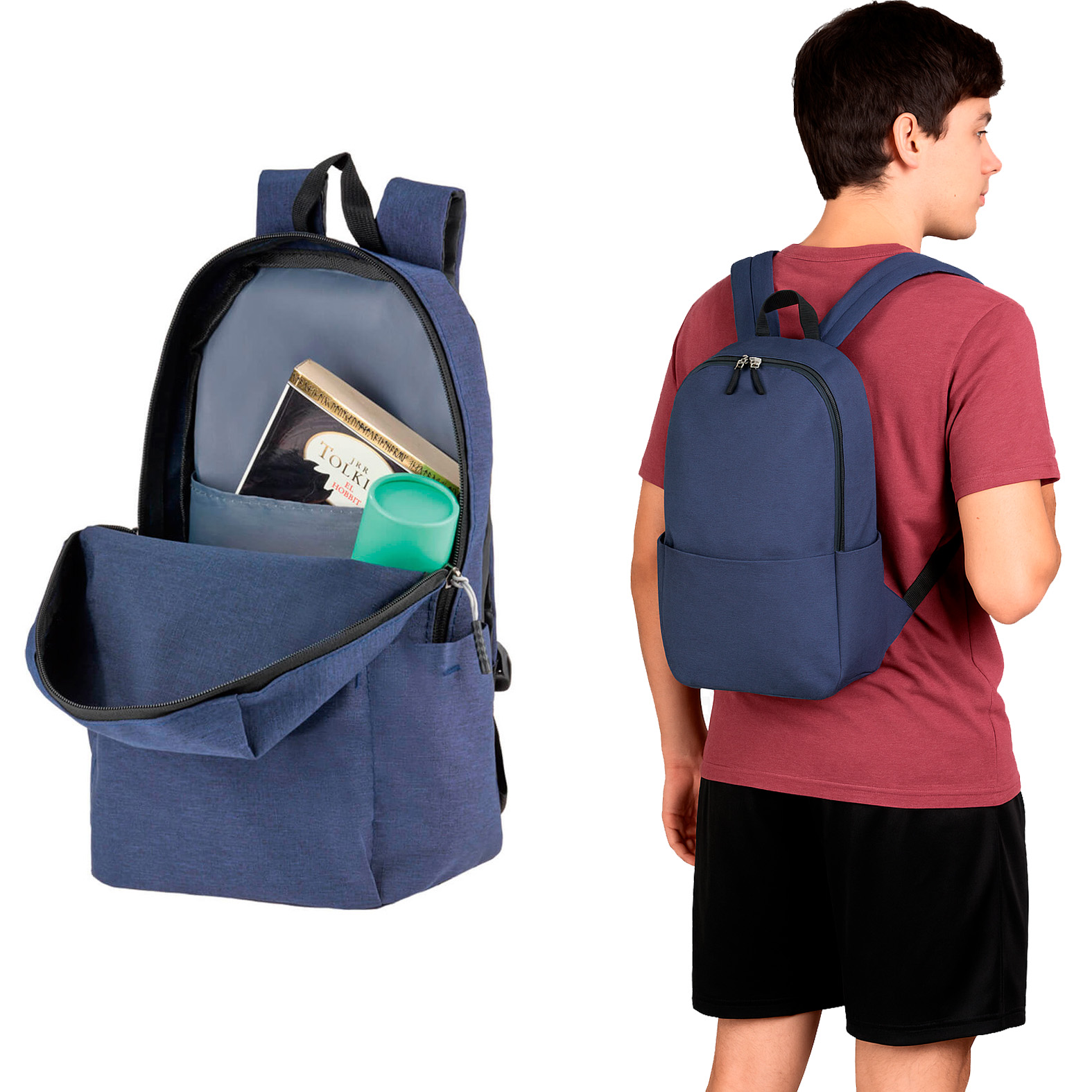 Mochila practica con compartimento principal, compartimento frontal con cierre y dos bolsas laterales.