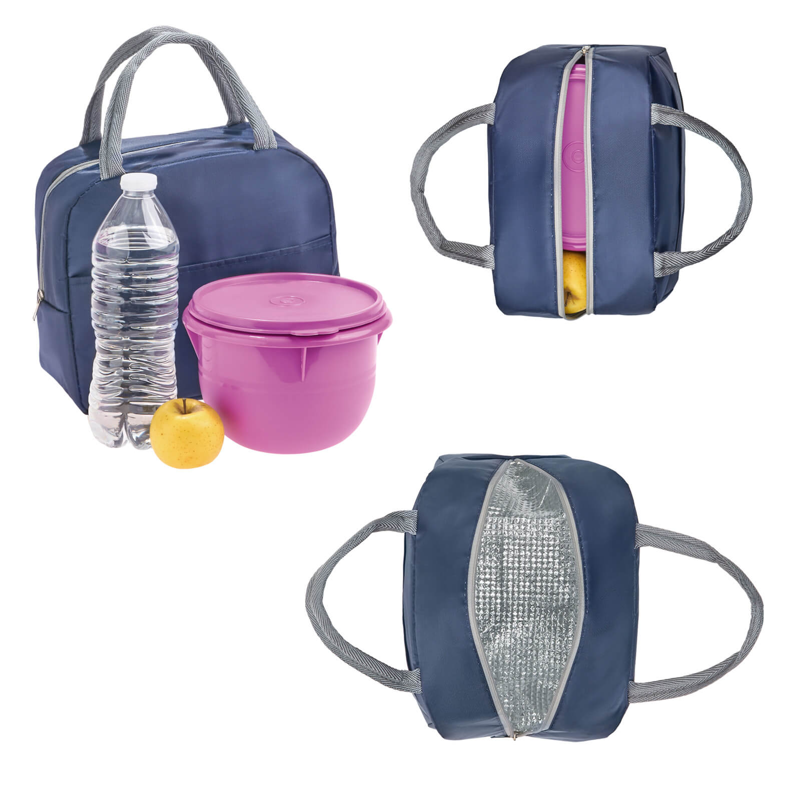Lonchera de poliéster con interior térmico metalizado, bolsa exterior y asa.