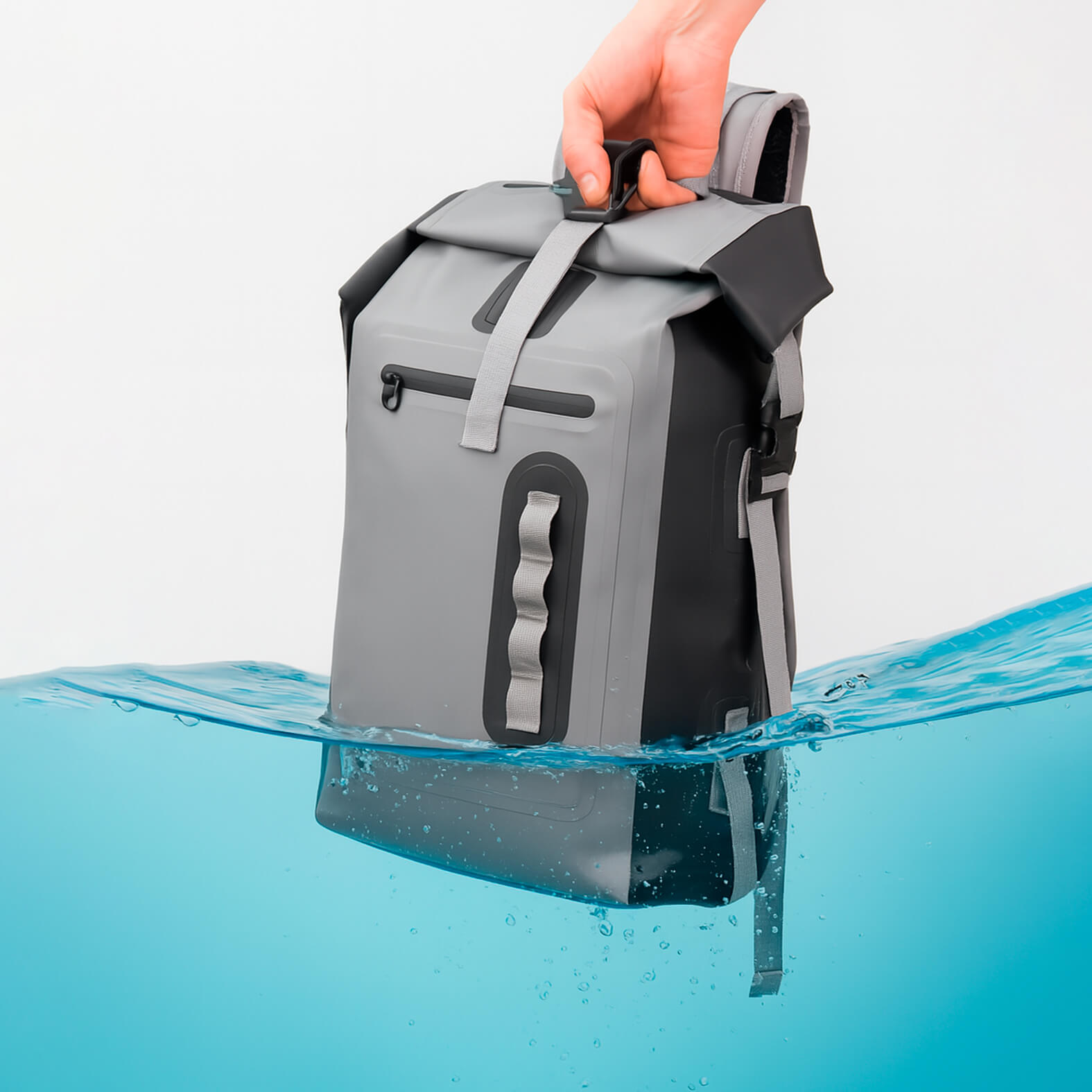 Hielera tipo backpack enrollable con broche bolsa frontal con cierre y correas ajustables.