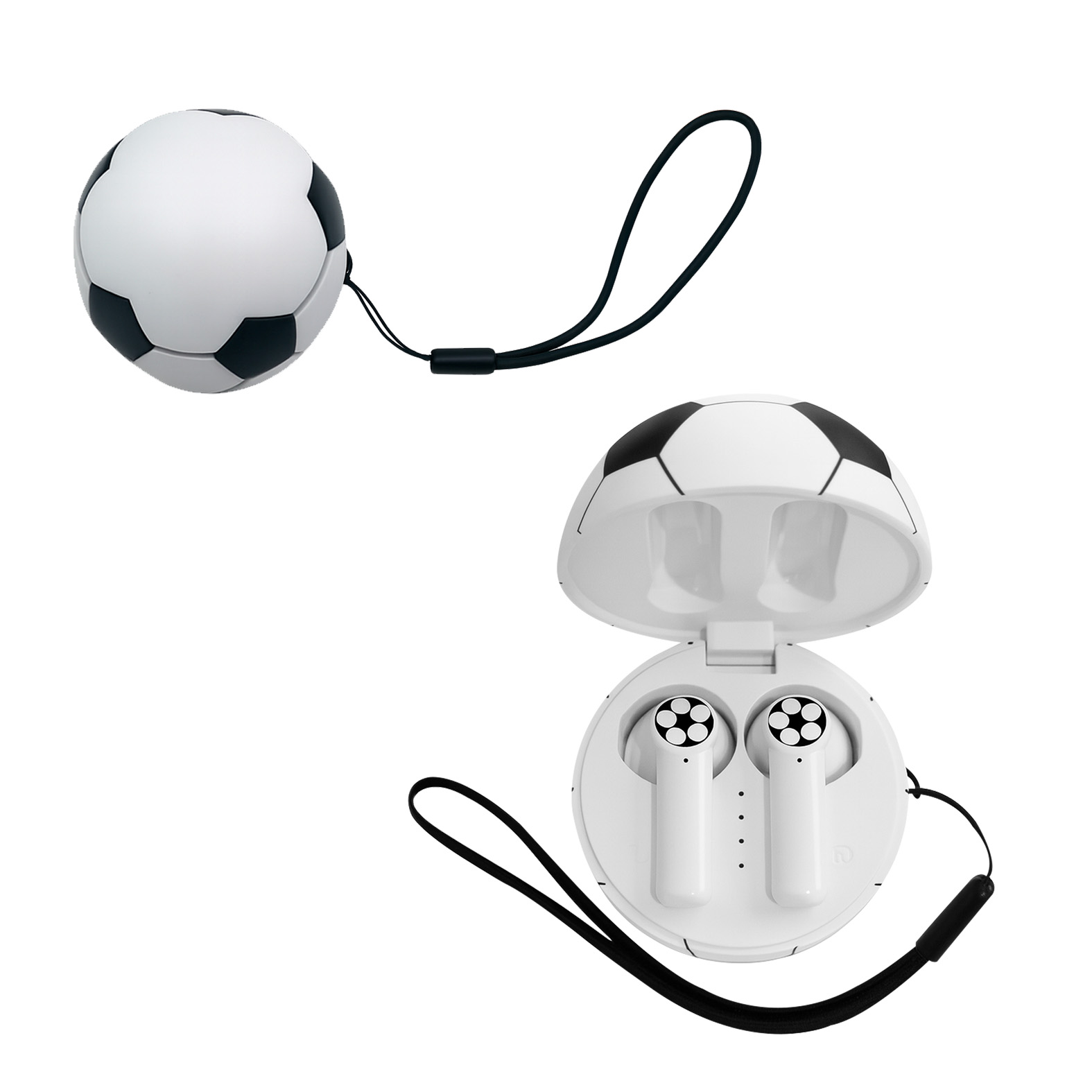 Audífonos bluetooth promocionales con estuche en forma de balón de soccer, ideal para campañas, eventos y posicionamiento de marca.
