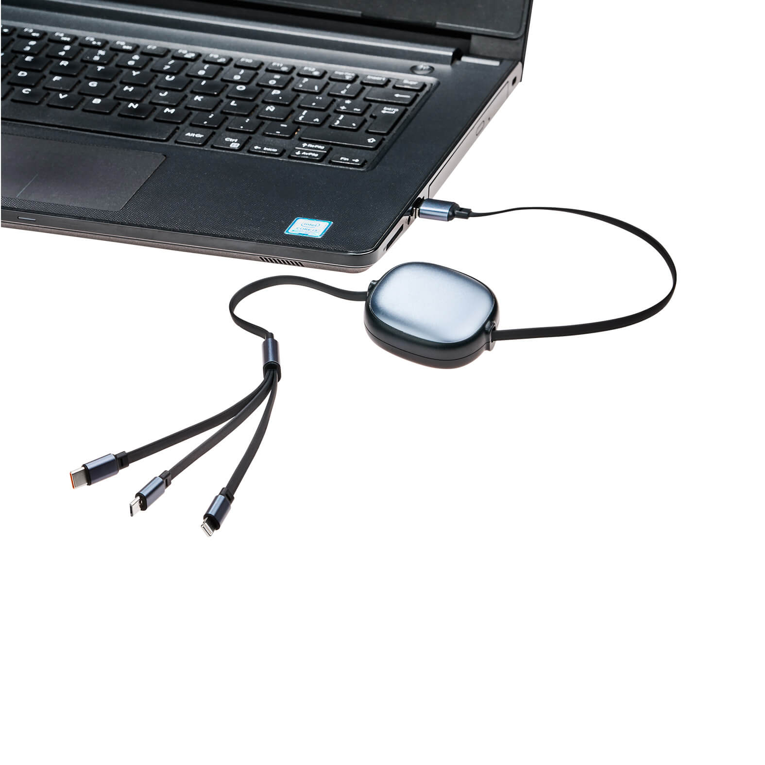 Cargador multifuncional extensible ovalado (115 mts.). Cuenta con entrada USB, tipo c y Lightning.