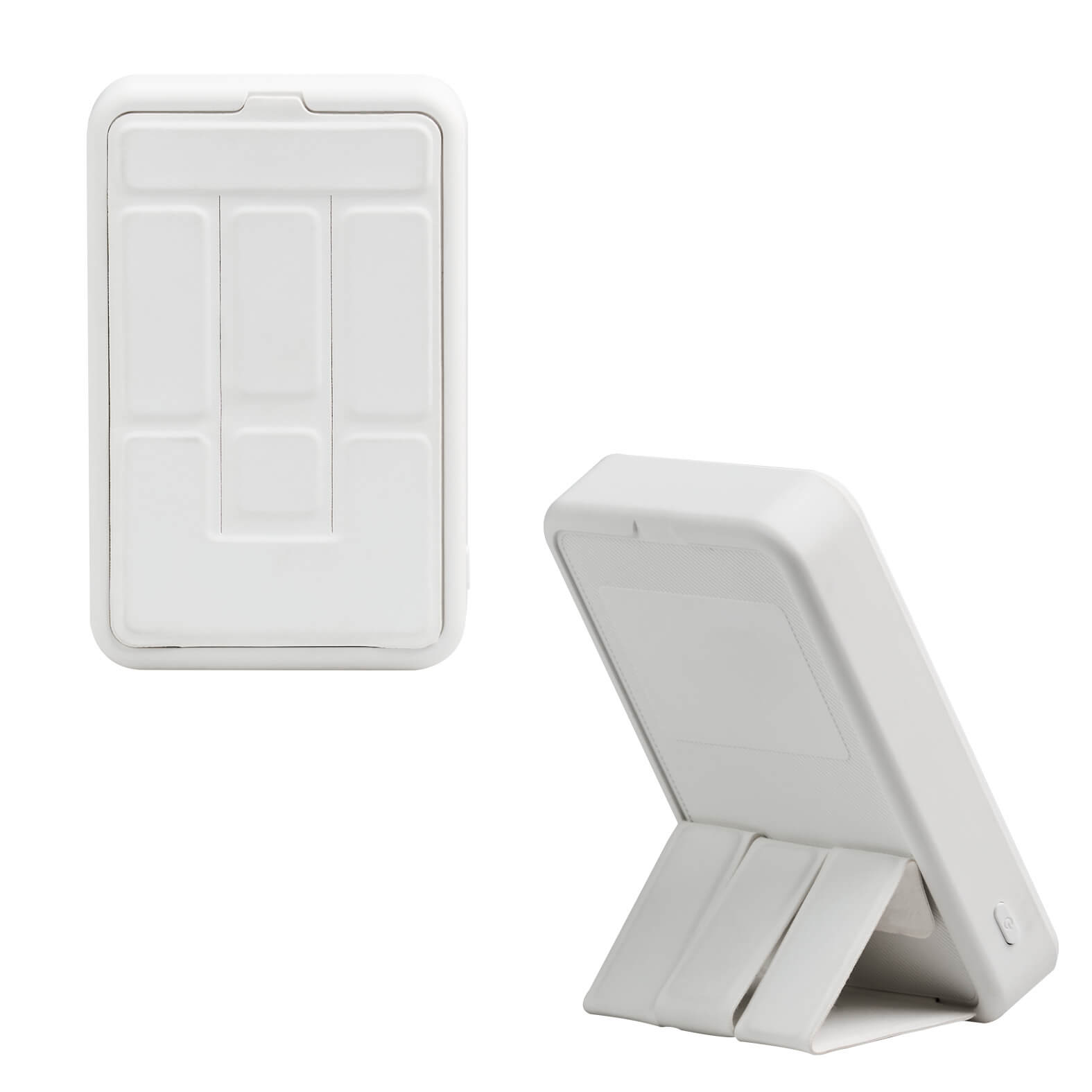 Powerbank inalámbrico de 10´000 mAh con acabado rubber y soporte plegable. cuenta con una entrada USB, una micro USB, una tipo C y una Lightning. (compatible con tecnología Qi).