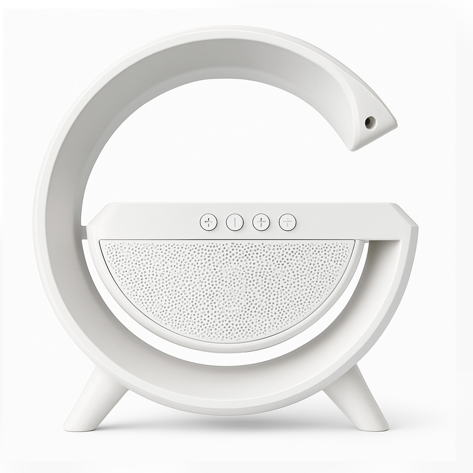 Bocina con bluetooth con luz de 7 colores y cargador wireless de 15w. Compatible con smartphones con tecnología QI. Incluye cable de carga.