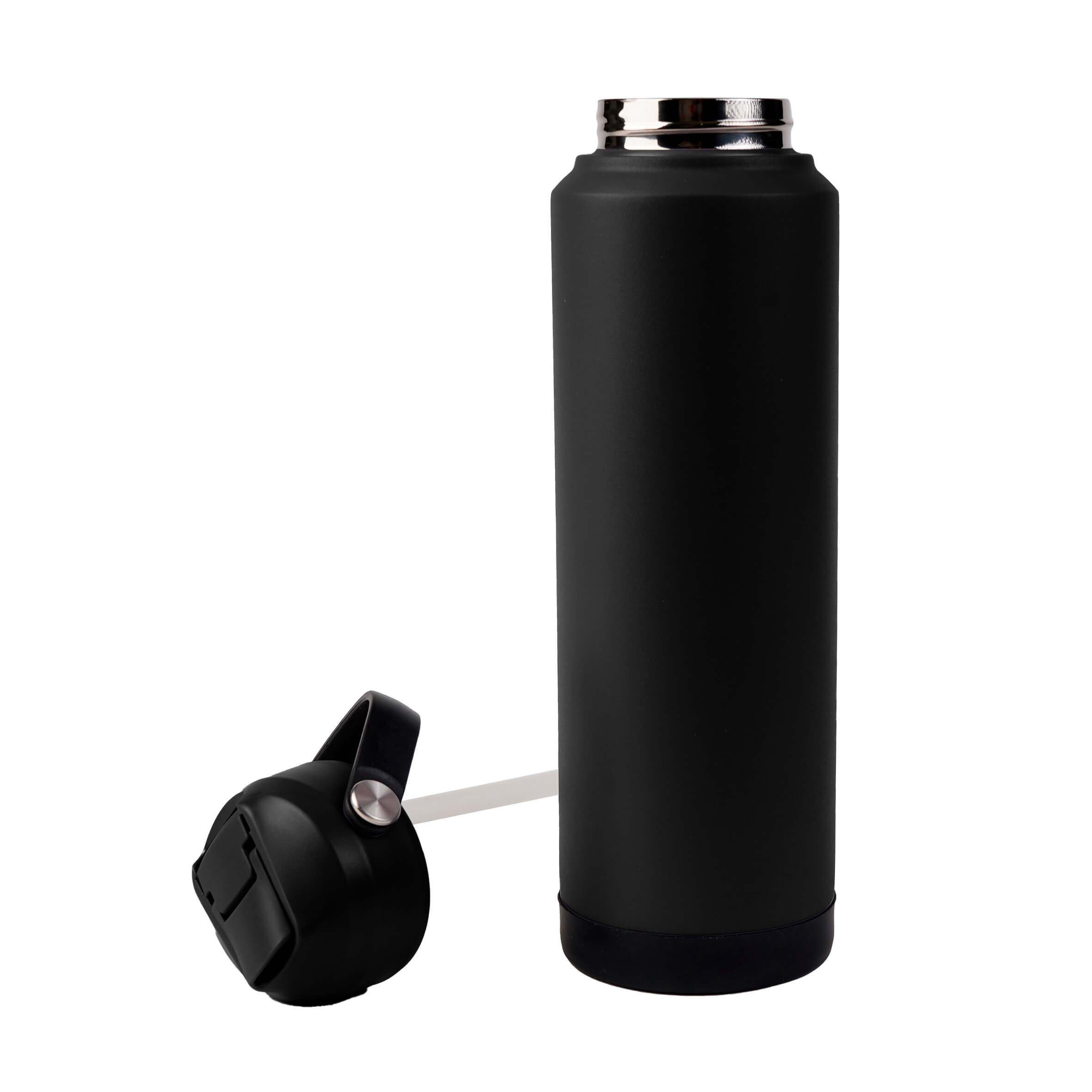Termo con doble pared de acero inoxidable, insulado al vacío, acabado rugoso, su tapa enroscable cuenta con boquilla abatible, popote y asa en la parte superior.
