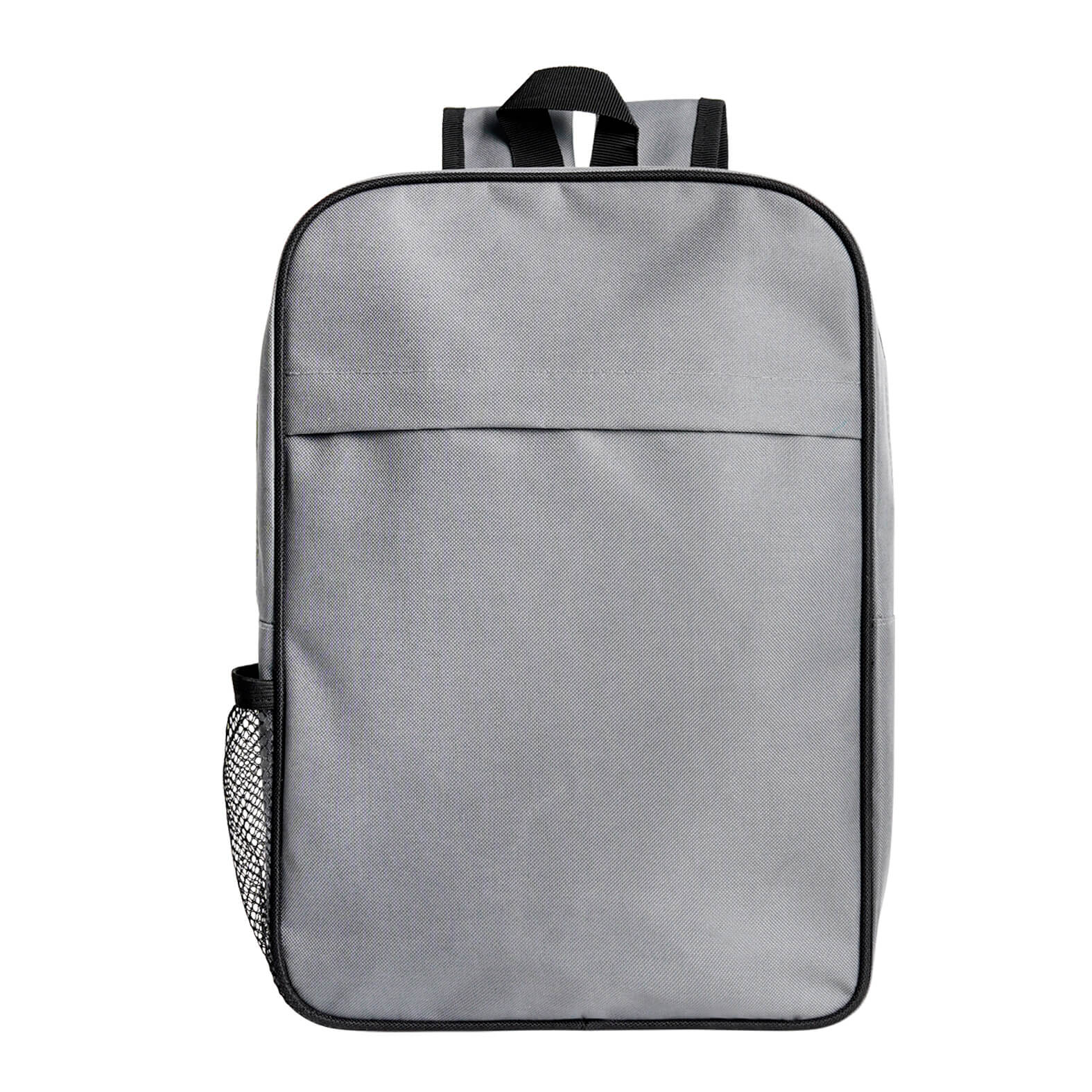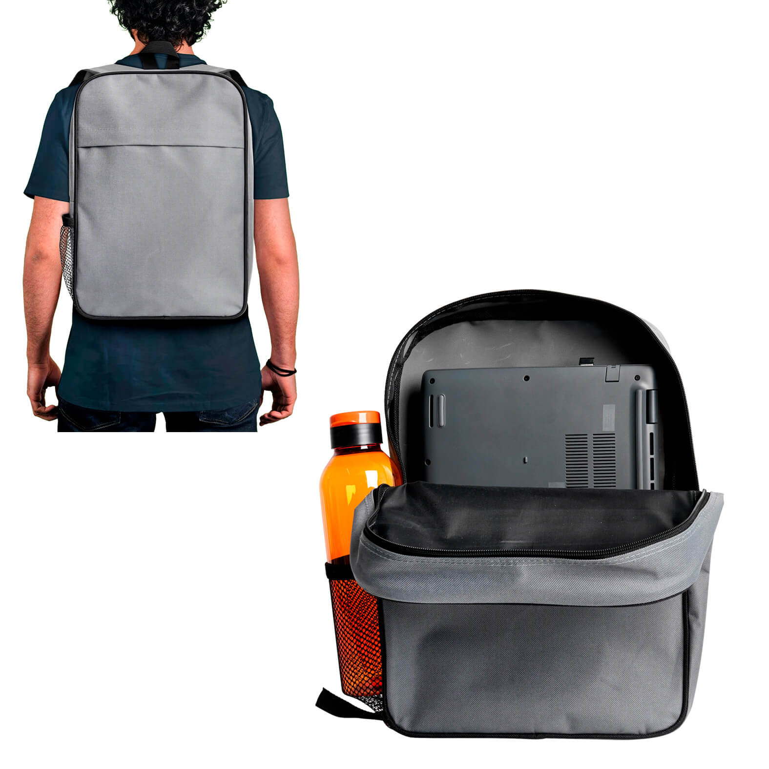 Mochila con compartimento principal, una malla lateral, compartimento frontal con cierre, asa superior y correas ajustables. Material: Poliéster. Capacidad: 9 lts.